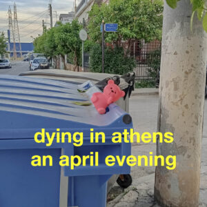 spotify playlists dying in athens an april evening the world is yours (and fucked up) Roller coasters aren’t fun under the summer sun When we remember we are all mad, the mysteries disappear and life stands explained they told of a life where spring is sprung A⅃OИ3 New Year, New Fails This is life! We suffer and slave and expire. That’s it! attention deficit disorder hot nights | bad dreams sad pop to those left behind and spring was not the problem anymore what can a song do to you? “the 20’s belong to the UK bands”, “wtf is chamber-psych”, and other stories Of course I had a dream. I just can’t remember it anymore. who cares about the standards of normal people? it takes an ocean not to break never underestimate melancholy become the best version of yourself by killing your local life coach sorry I left you on read. the heat was suffocating. my chest was burning. life in vain what kind of punk is this? path(ologies) of power living in this city is satisfyingly brutal, but I’ll not sleep peacefully until we all feel safe I feel like a song that didn’t make it to the album if poetry was a person, it would probably hate “world poetry days” letting go is easy if you are a natural giver-upper 2020 – is this ever going to end? (Best songs of 2020) your problems will not end with the end of the year stress is the new black hey, do you remember this? awkwardness is a gift we don’t deserve things don’t always turn out as we plan them (and other stories) nobody exists on purpose, nobody belongs anywhere, everybody’s gonna die, it’s Spring. Click here for YouTube links